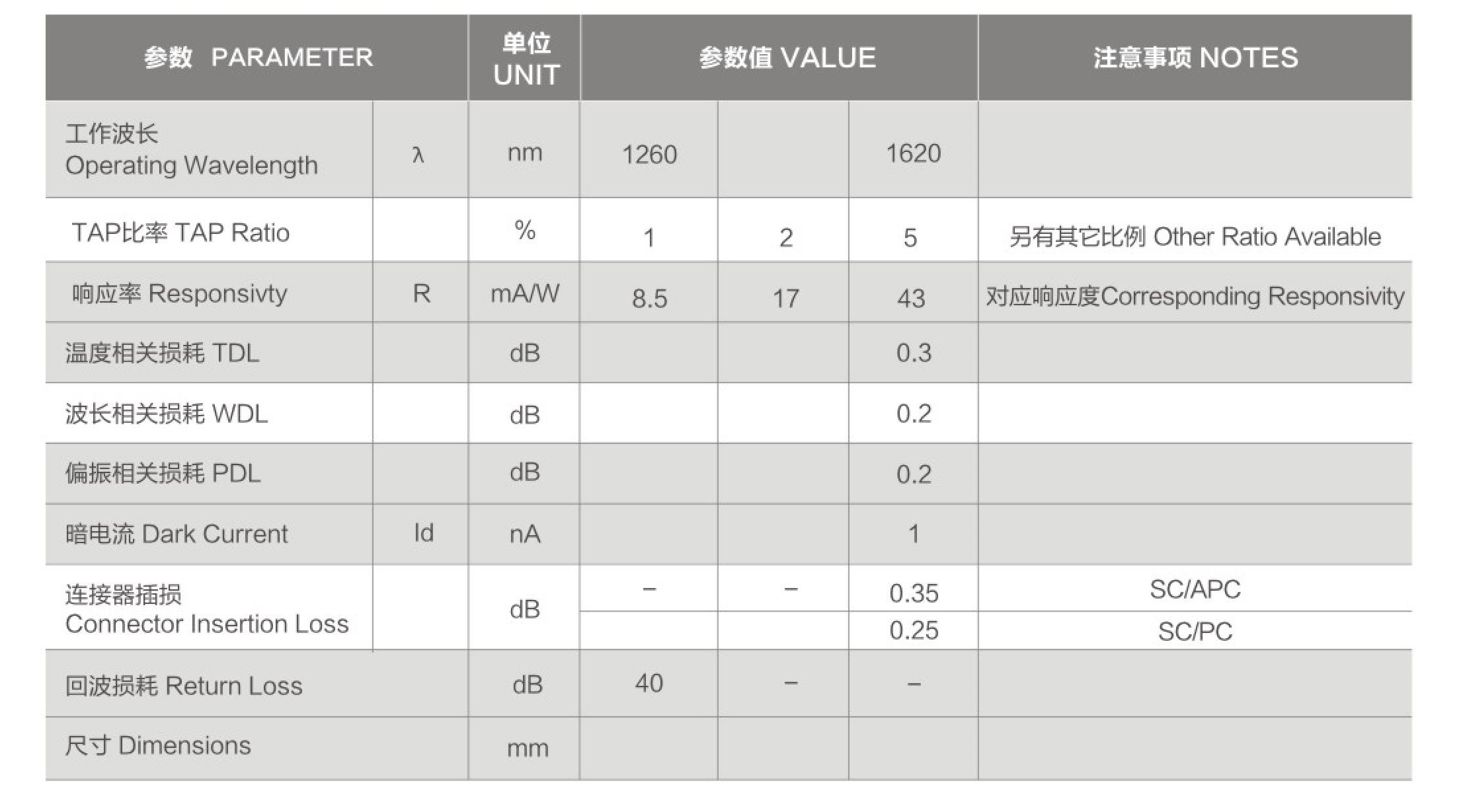 雙芯尾纖式結構,實現一定比例的光透射到探測器,其余的光反射到另一根光纖。用于WDM網絡監控、光纖放大器、光開關等。
